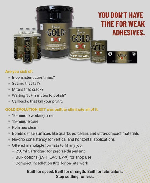 Superior GOLD EVOLUTION EXT utlitizes their world renowned Gold adhesive thchnology but is colored & activated with their proprietary colored hardner available in a large assortment of colors. Easy to use, versatile, provides tremendous cost savings and is designed for the toughest bonding applications including: Porcelain, sintered materials, quartz, and granite and Marble.